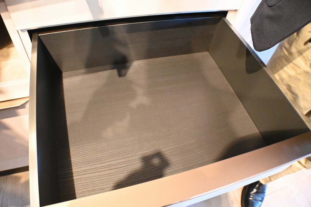 引出しを薄型のシンプルな引出とし、独ヘティヒ社「AvanTech YOU」を国内の家具メーカーとして初採用した。なめらかで滑るような操作性が特長だ。レールの耐荷重は40㎏で、頑丈かつ美しいデザイン性を両立させている。