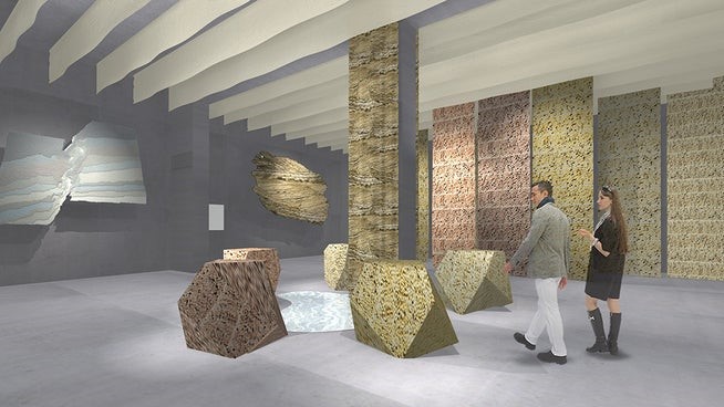 展示は、石や土壁の硬質な表情を参照しながら、触れたときに心地よい織物として提案する点に特徴がある。素材選定から織組織の設計、密度制御まで工程を幾層にも重ね、硬さや粗さ、乾き具合といった捉えにくい感覚を「織の表情」として再構成する。自然素材の質感を建築・インテリア空間に柔軟に取り入れたいという需要の高まりを背景に、椅子張、クッション、パーティションなど実用用途への展開も視野に入れる。質感を空間のスケールや光環境に応じて選び分けられる構成とし、意匠にとどまらず、空間の重心や境界、雰囲気を支える素材としての役割を示す。