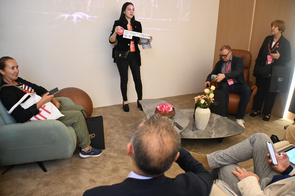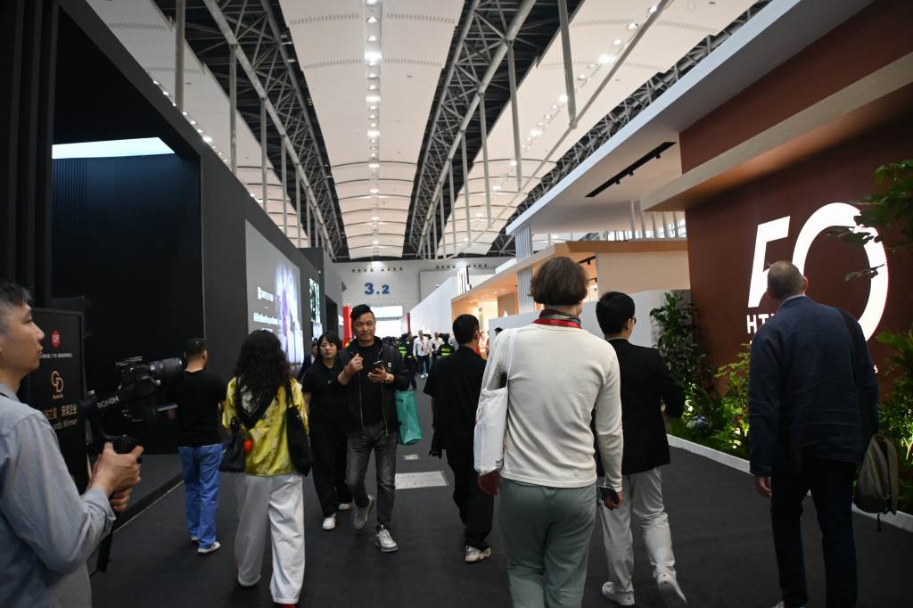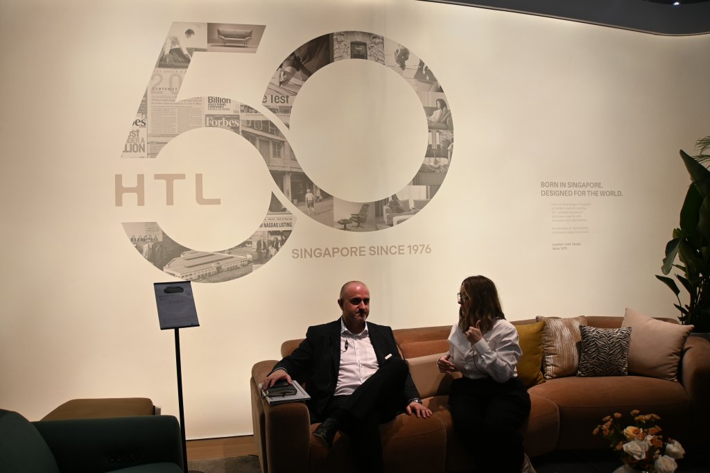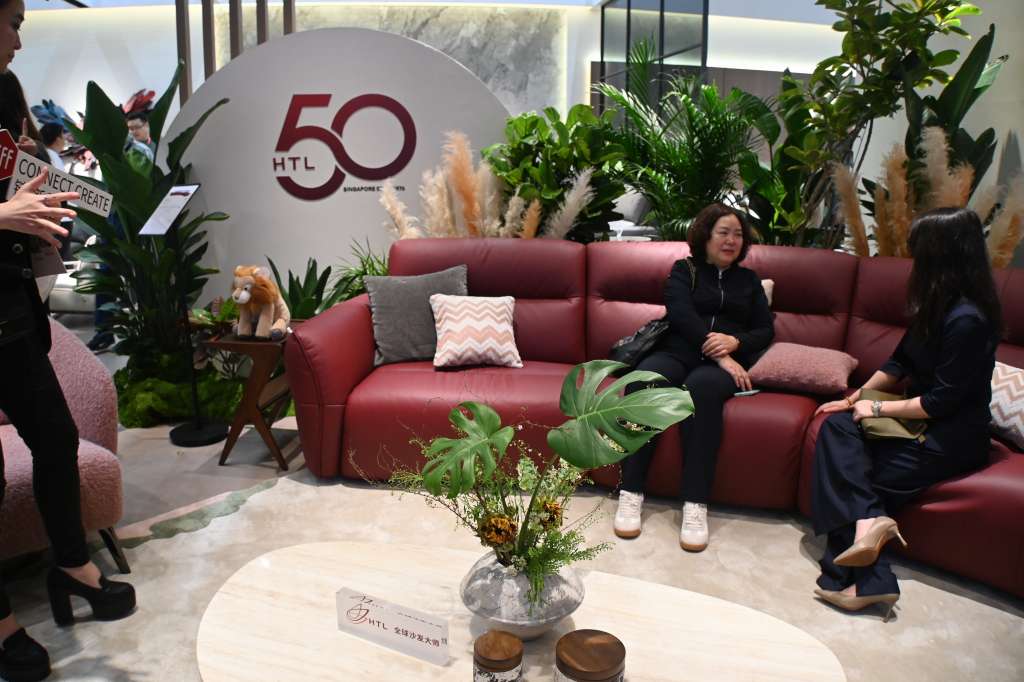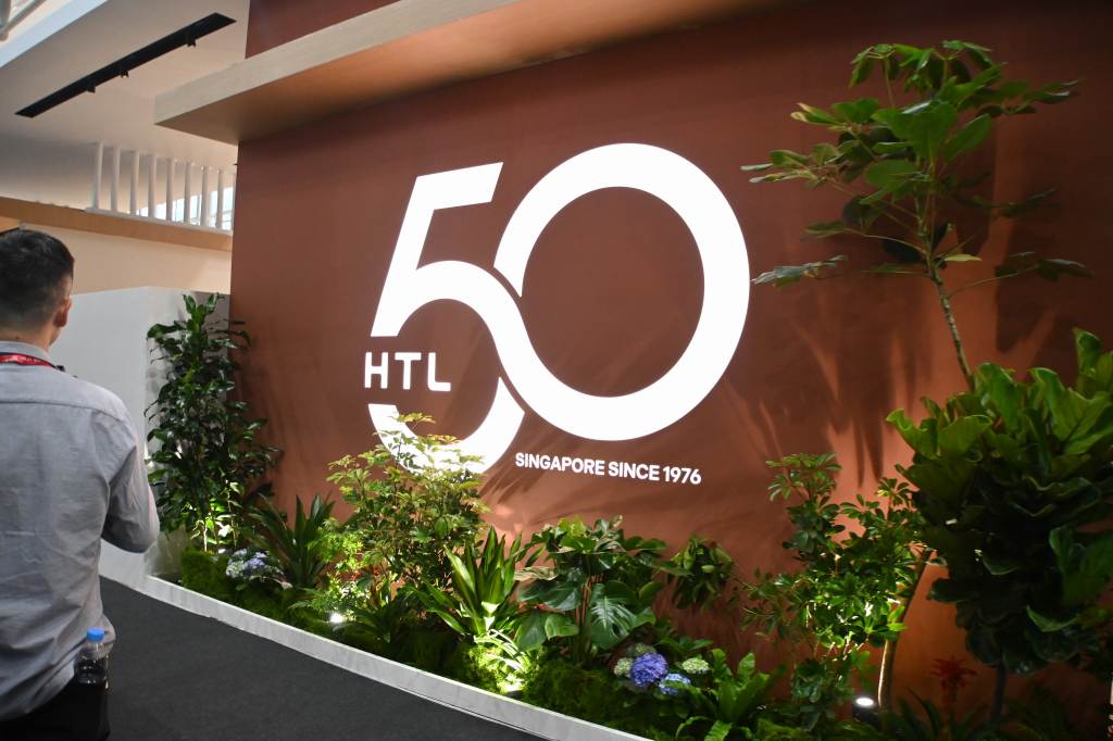 会場では「50 HTL SINGAPORE SINCE 1976」の大型サインを正面に掲げ、木質壁面と植栽を組み合わせた外観で来場者を迎えた。受付奥にはブランドヒストリーを見せる壁面を設け、広い通路側から商談スペースへ自然に導く構成とし、単なる製品陳列ではなく、ブランド体験まで含めた見せ方を徹底した。CIFF会場の国際ブランド群の中でも、HTLは周年訴求を軸に存在感を強めた出展の一つだ。