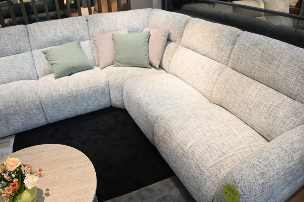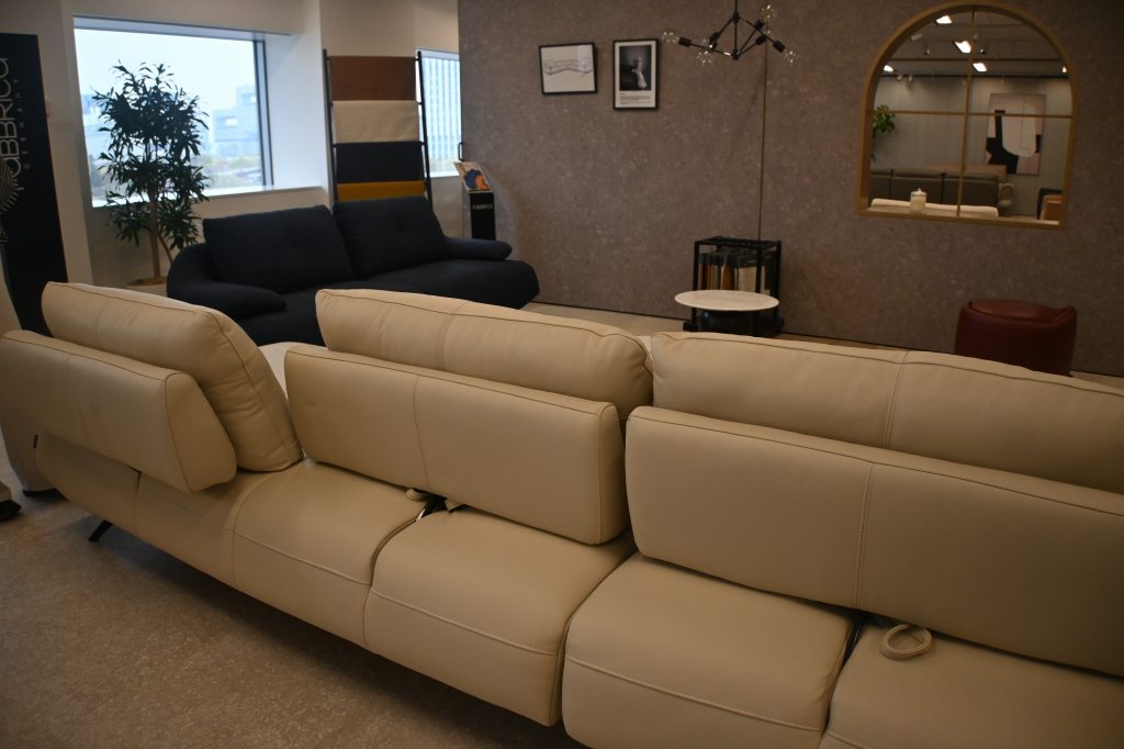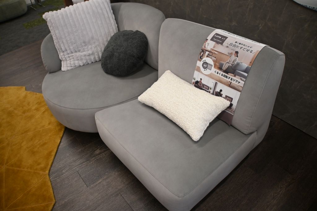 新しい電動ソファでは、可動機構を持ちながらロボット掃除機が入りやすい構造も提案しており、機能性を単なる付加価値ではなく、生活上の使いやすさへ結び付けようとする姿勢がうかがえた。革張りを主力としながらも、ファブリック需要の広がりも見据え、素材提案の幅を広げている点も特徴だ。