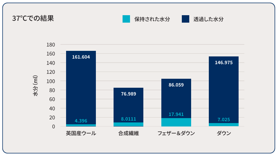 試験方法:各掛布団の充填素材のサンプルを、35cm × 35cm の布片として水槽の上部に設置し、周囲を密閉して水と接触しないようにした。この構成により、素材は下の水に触れることなく湿気のみを通過させることができる。水は人体の通常の体温を示す37℃ に加熱し、さらに湿気が多い条件での性能を確認するため50℃ に設定した。