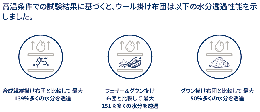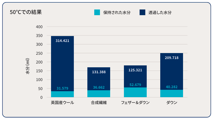 温度が 50℃ に上昇すると、システム全体の水分量が大幅に増加し、それに伴い湿度バッファリングおよび水分移動のレベルも高くなった。この条件下でも、ウール掛布団は試験された他の充填素材より優れた性能を示し、ダウンよりも多く、さらにフェザー&ダウンや合成素材と比較すると大幅に多くの水分を透過させた。
